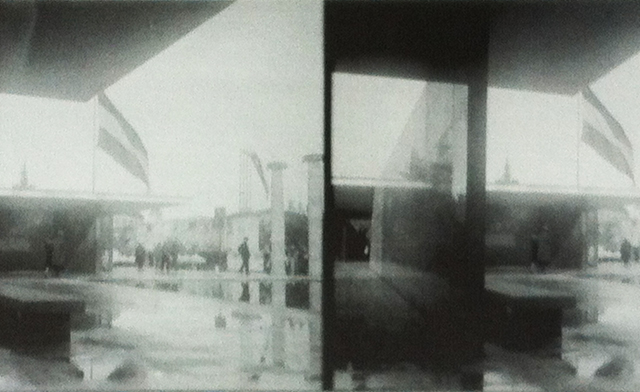 La fotografía que acompaña a este texto se corresponde con un fragmento de una fotografía estereoscópica anónima del año 1929. En esta fotografía se observa, como atinadamente comenta Juan José Lahuerta como el Pabellón se levanta no como una cosa, sino como aire nada más, aire enmudecido sobre un pedestal, siempre traspasando sus propias paredes, atravesándose a sí mismo. Virtud terrible, sin duda: encerrada en todas partes, aquí y allá, congelada en su propia perfección de Nada y de Ningún Lugar.[2]