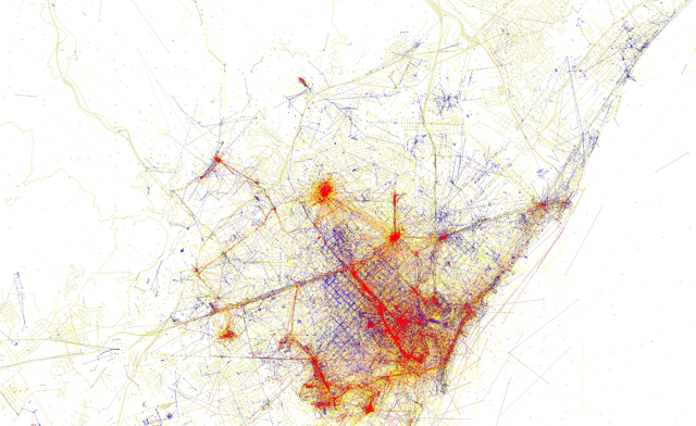 *La imagen del post es parte del proyecto The Geotaggers’ World Atlas de Eric Fischer, en el que mapifica los puntos en que las fueron tomadas fotografías realizadas por turistas y locales, componiendo una nueva geografía, en este caso de la ciudad de Barcelona.