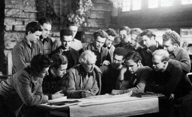 En la imagen, Frank Lloyd Wright rodeado estrechamente por estudiantes en el Taliesin Fellowship program, diciembre 1937. Fotografía de William Hedrich.
