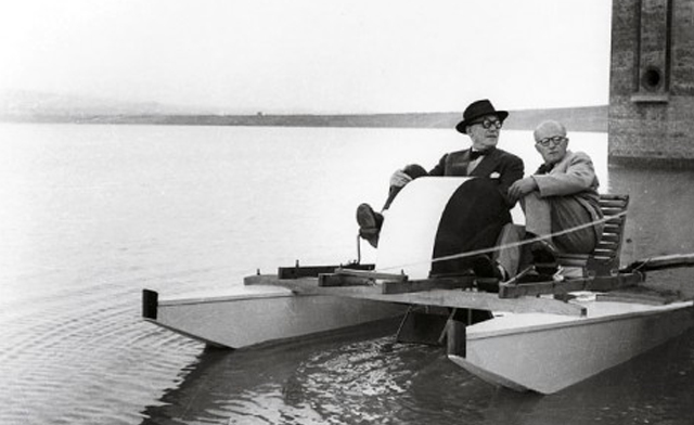 En la imagen Le Corbusier y su sobrino, Pierre Jeanneret, relajándose en el lago Shukna sobre un bote a pedal hecho por Pierre Jeanneret, 1950. Foto por Sureh Sharma.