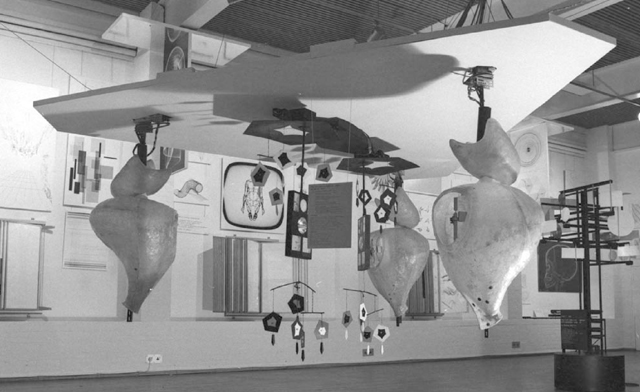 En la imagen The Colloquy of Mobiles. Una pieza pensada por Gordon Pask para la exposición Cybernetic Serendipity realizada en el ICA de Londres en 1968. La pieza consistía en cinco móviles coordinador por un ordenador. Ya fuere por la luz o el sonido, los cinco móviles colgados del techo empezaban a interactuar. Más información en http://www.medienkunstnetz.de/works/colloquy-of-mobiles