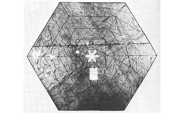 A Nonsite (an indoor earthwork) 31 sub-divisions based on a hexagonal “airfield” in the Woodmansie Quadrangle – New Jesey (Topographic) map. Each sub-division of the Monsite contains sand from the site shown on the map. Tours between the Nonsite and the site are possible. The red dot on the mapis the place where the sand was collected.