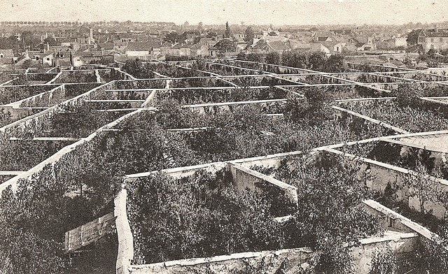 En la imagen un conjunto de muros frutales, granjas urbanas de árboles frutales que aprovechan el calor acumulado del día para crear un microclima. En este caso, la fotografía es de la ciudad de Montreuil cerca de París que en 1870 tenía una extensión de 300 hectáreas. Más información en http://www.resilience.org/stories/2016-01-06/fruit-walls-urban-farming-in-the-1600s