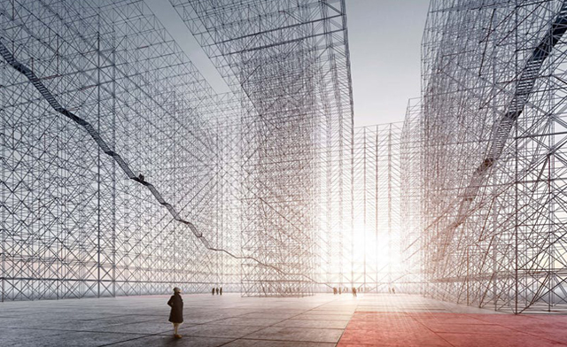 En la imagen una reproducción del famoso Rascacielos Horizontal de El Lissitzky según la interpretación “desvanguardia” de Guillaume Mazars. “La propuesta, según la memoria del concurso, es establecer un monumento que haga eco de las diversas obras de El Lissitzky. El objetivo es hacer perceptible la noción de espacio y profundidad con una estructura tridimensional. Este sistema será la herramienta para revelar el vacío, la profundidad, las proyecciones … Al principio, este sistema ofrece revelar la ausencia, o en otras palabras, el no construido. El Wolkenbrugel es uno de los proyectos más famosos de El Lissitzky, pero desafortunadamente sin manifestación física. El proyecto consiste en una cuadrícula ortogonal tridimensional conforme al tamaño de Wolkenbrugel. De esta huella, es la imaginación del visitante la que completa la proyección virtual del monumento. Por la noche, una red de luz revela los contornos virtuales del Wolkenbrugel. En un segundo paso, el marco es un soporte estructural para la puesta en escena de líneas gráficas. Varios elementos estructurales pintados de rojo, el color más utilizado por El Lissitzky, crean una composición gráfica única según cada punto de vista. Estas líneas rojas colocadas juntas en el espacio, forman varias composiciones gráficas por desplazamiento.”