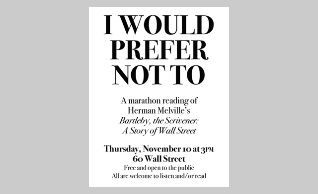 En la imagen el Cartel del Maratón de lectura de Bartleby, the scrivener: A story of Wall Street, el 10 de noviembre de 2011 en Wall Street, dentro de los actos de Occupy Wall Street