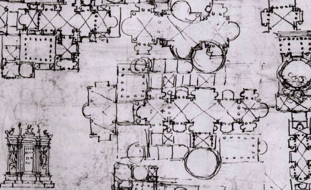 Palladio seems to be manipulating combinations of circles and squares into various alternatives, without concern for the beauty of the sketch. In contrast are the wavy lines of x’s that convey a slow, thoughtful movement of the pen. The technique and the possible purpose of these marks suggest that these x’s were added later, at a time when Palladio was more intently evaluating the design, or when he began to think three-dimensionally.