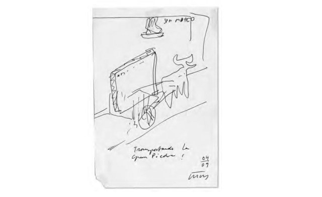 Luis Moreno Mansilla trazó un pequeño dibujo al pie de la obra del restaurante Atrio de Cáceres. En él se lee, “Transportando la gran piedra”. En estos sencillos trazos se puede leer la historia de un restaurante único y cómo se ha tejido en torno a la conjunción de un grupo de personas con un gran talento.