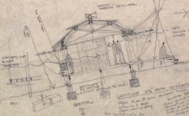 This sketch describes a section study for the small Marika Banduk (Alderton) House. Rendered in pencil on “butter paper” (yellow tracing paper), Murcutt envisions the complex integration of structure, environmental controls, and interior space for humans. The techniques show a slow and contemplative hand; expressing the winds as wavy lines becomes an analogy for the movement of air and the movement of the pencil. The deliberate lines study the intensity of the sun and the structure of the roof. The roof has been structured with beams, showing the space between the roofing material and the bracing. The floor, in section, indicates the joists and foundations.