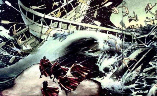 En la imagen una de las páginas de la novela gráfica de Frank Miller 300 publicada en 1998 y ganadora de varios premios. En España fue publicada por Norma Editorial en 2006. Esta novela gráfica fue adaptada al cine por Zack Snyder y estrenada en 2007. El comic cuenta, no sin ciertas licencias históricas, como Leónidas I, rey de Esparta, con apenas 300 soldados y un ejército en total de 6.000 hombre se enfrentó a Jerjes I rey de Persia y un ejército de 210.000 soldados en el paso de las Termópilas. La resistencia que opuso al ejército persa permitió a la armada griega reagruparse, si bien Leónidas I y sus espartanos murieron en la batalla y se convirtieron en una leyenda.